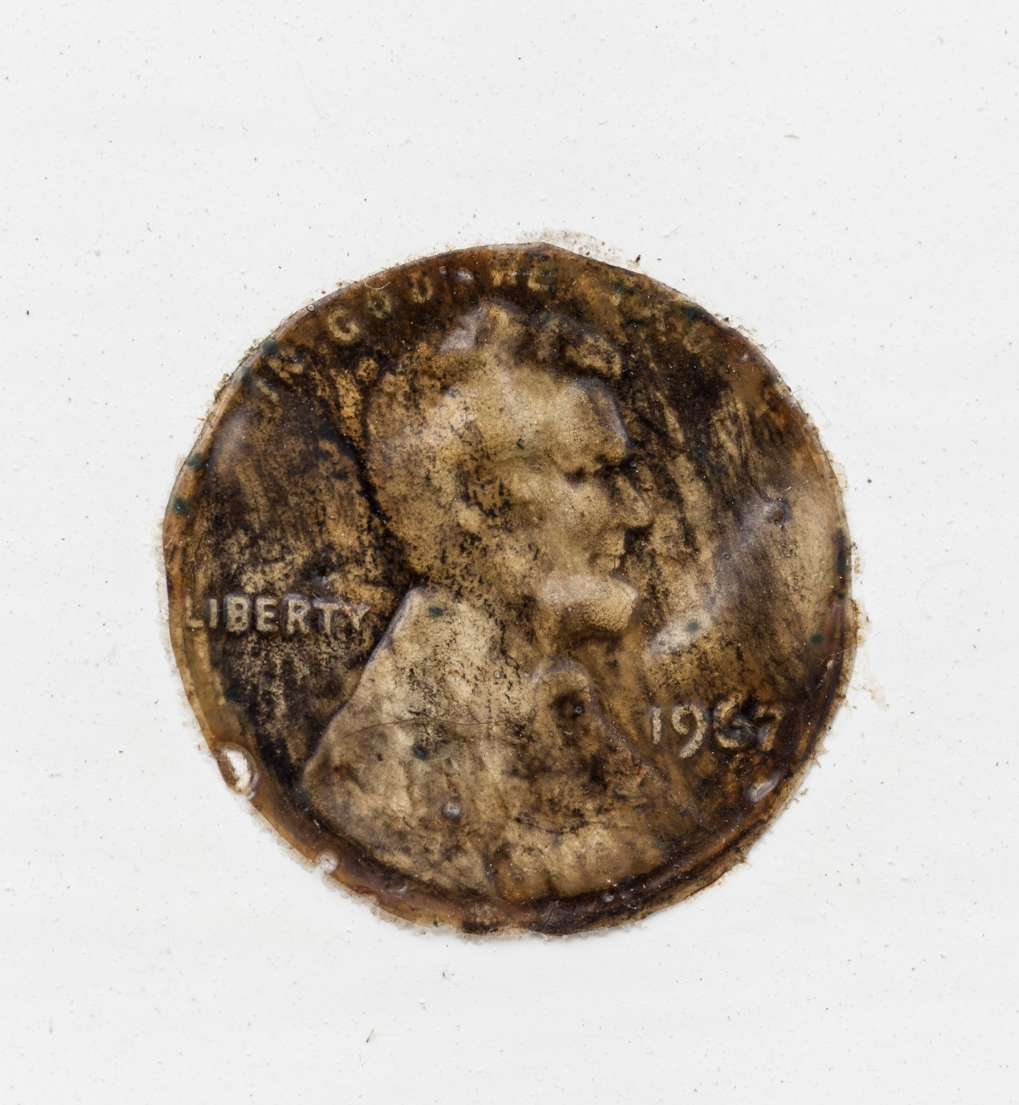 1美分是美国货币的最小单位,几乎毫无价值。每个人摸它、用它,随手将之丢弃在罐子里。这种日常经验、平常性、看似无意的东西让我非常感兴趣。我将每一个1美分硬币的正面涂上乳胶,干后再剥离的乳胶形成了一层浅浅的浮雕。半透明的林肯头像上,留下了不断累积的脏污以及氧化了的铜绿。每一枚浮雕不单是这枚硬币的现存状态的肖像画,我也保存采集下来它旅行时每个使用者在上头所留下的痕迹。而美国的建国意识象征:林肯头像、“自由”及“我们以上帝名义信仰”的字样,在每个具有个体性的浅浮雕中转化了其意义。