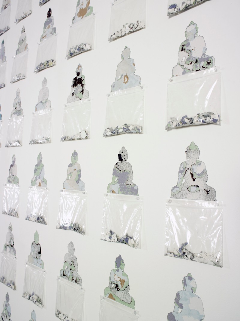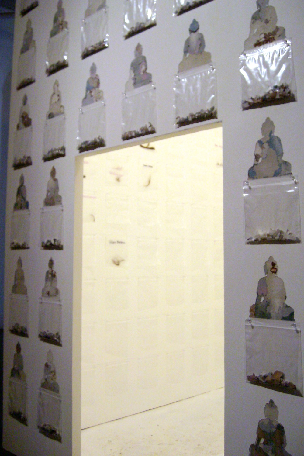 In this work, I carved hundreds of a repeated image of a sitting Buddha on the walls. What's inside of the walls has revealed as I carved the images. It was like to reveal cycles of that Buddha figure's life. I then carefully collected the cut-off scraps and saved them in a small zip-lock bag under that carved image. Each image therefor became a visual narrative on its own with its own story, a story left up to the viewer to discern.